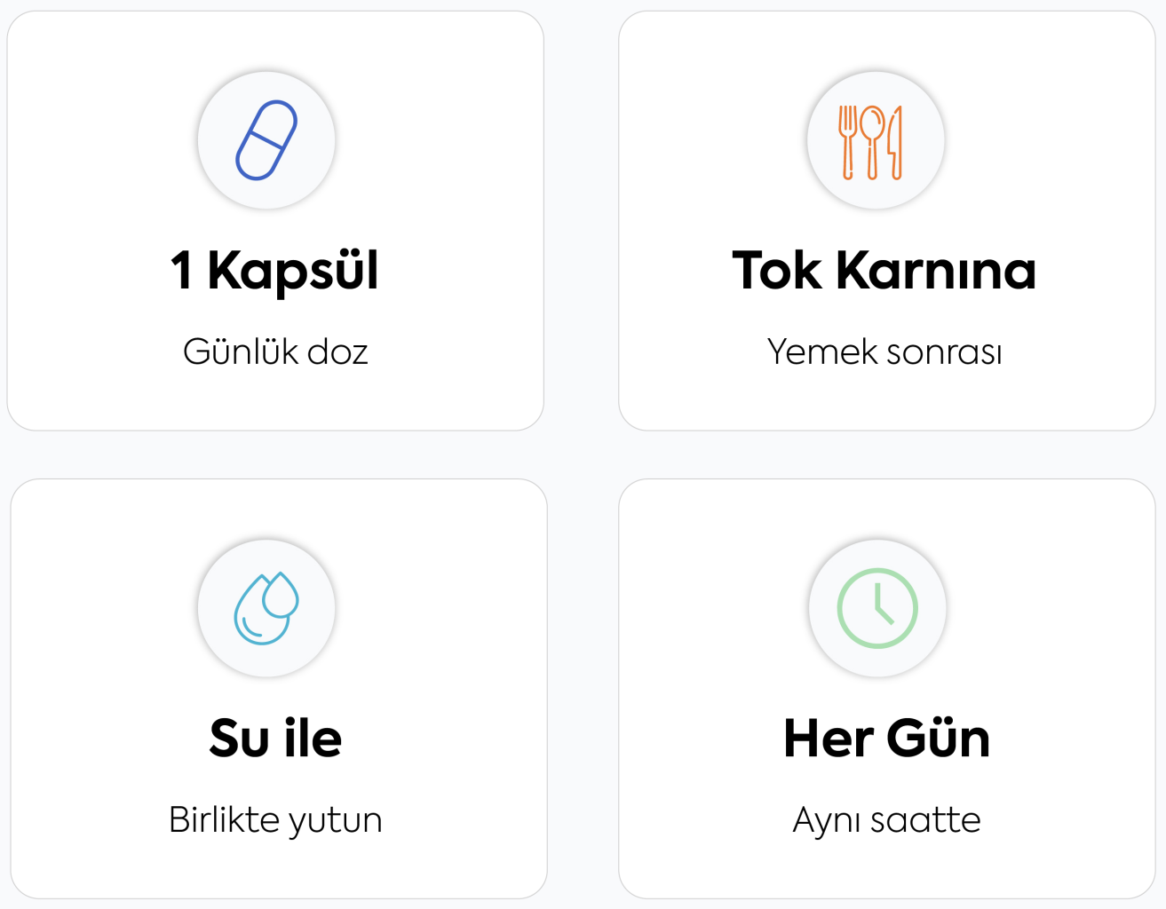 Günde 1 kapsül, tercihen yemek sonrası su ile birlikte alınması önerilir.